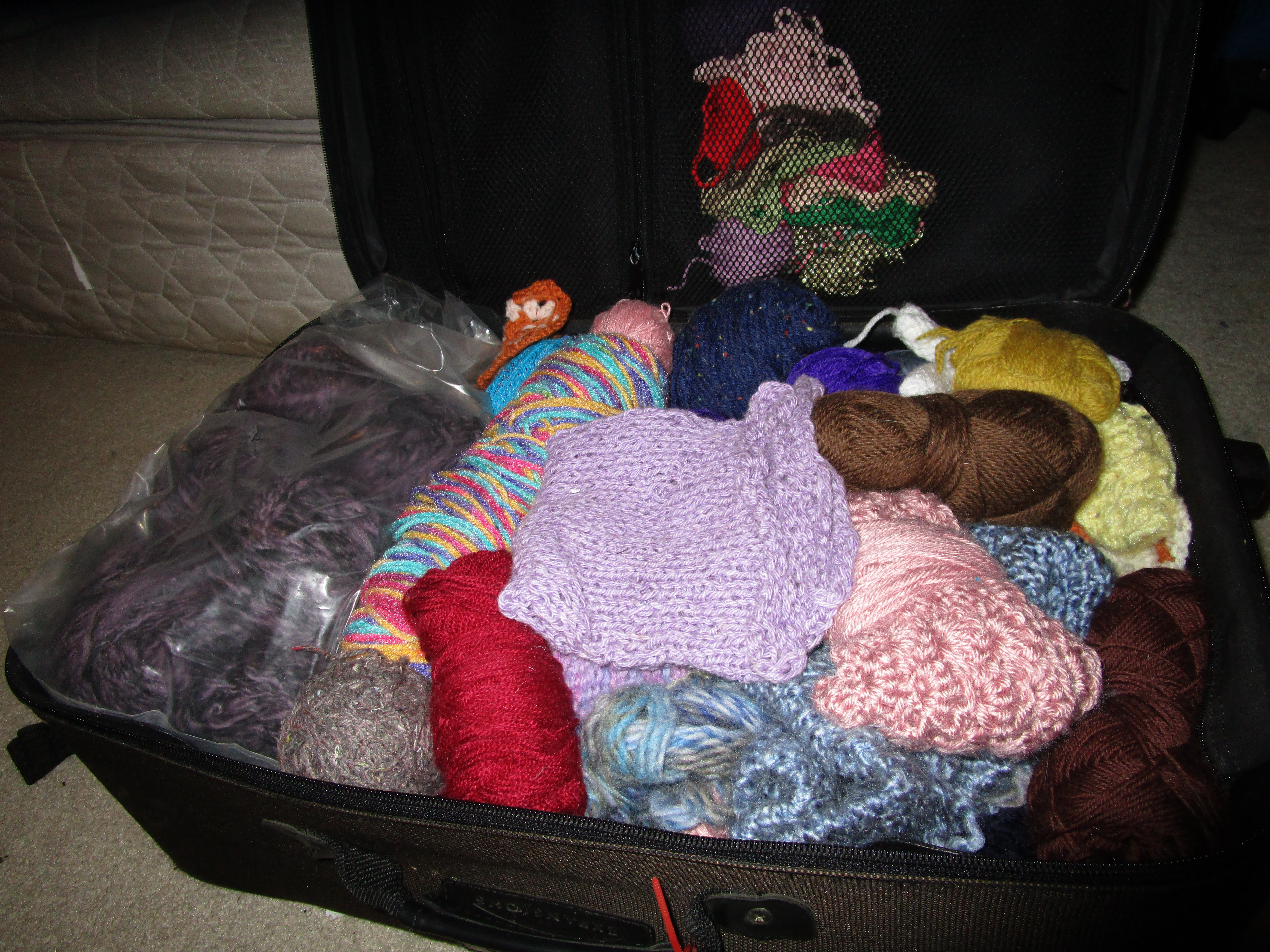 Last Friday started out to be a very unproductive day. After a couple of hours of struggling to find something meaningful to do, a large tangle of yarns on the floor of a closet drew my attention. The yarns used to be in a large plastic trash bag with the top tied in a knot but someone—not me, I don’t think—had untied the bag and tangled up the contents. No one uses the closet regularly after most of our children have moved out, so the thing has probably been sitting there for months.